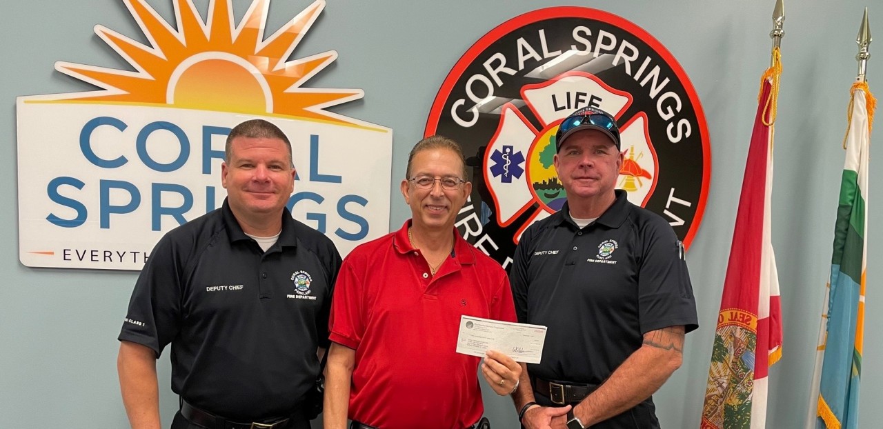 Coral Springs Parkland Assistant Fire Chiefs (l) Mike Moser and (r) John Whalen accept a $250 donation from CERT Program Chief Joseph Chalom on behalf of PlanMember Financial Corporation. The gift will be used to help fund the Coral Springs Parkland CERT program.