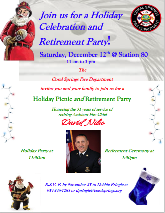 The CERT team has been invited to attend the Coral Springs Fire Department Holiday Picnic and Retirement Party. This event is in place of our December monthly meeting. If you plan on attending you must RSVP to Debbie Pringle by Nov 24 with the number of people attending. This is a great opportunity to enjoy an afternoon with your teammates and meet the men and woman of the Fire Department that we support.